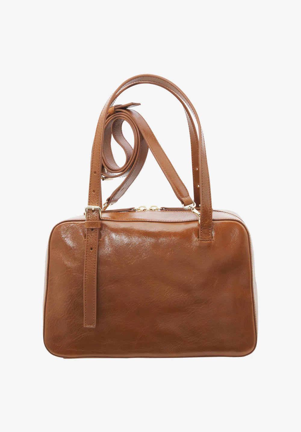 - Crinkled leather bag. *Two handles that adjust with silvertone metal buckles to carry the bag by hand or on the shoulder.