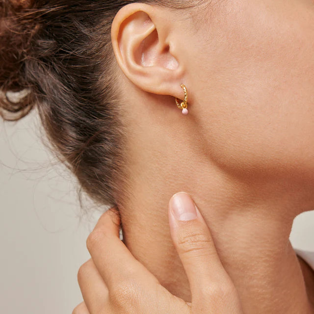 Our Belle hoop gets a clean and refined expression in this version in 18k gold-plated 925 sterling silver with a light pink ball. The small hoops still have the raw twist with the organic surface, but combined with the pendant they create a fresh and minimalist look. A perfect choice for those who love the simple with an edge.