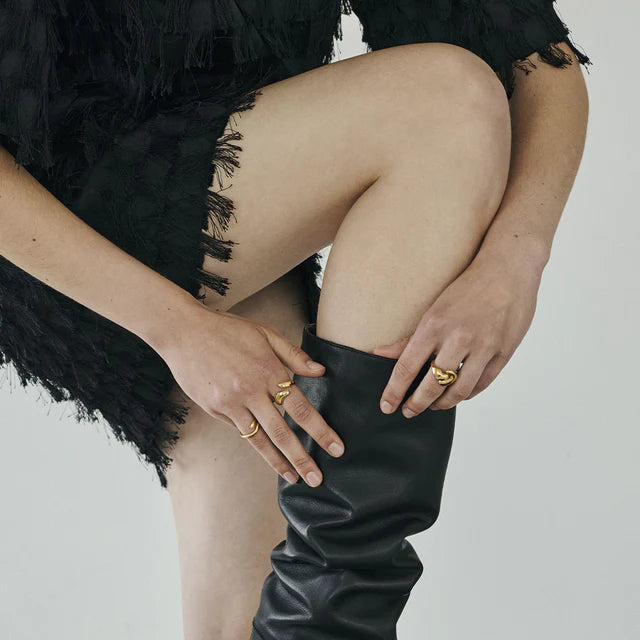 The Neli Ring, plated with 18 karat gold, is designed with inspiration from the soft movements of nature. It has an elegant, open silhouette with voluminous shapes that wrap around the finger. The shiny gold surface provides an exclusive and modern expression, while the adjustable size ensures it fits perfectly for you – no matter the occasion. The Neil ring is also available in silver.