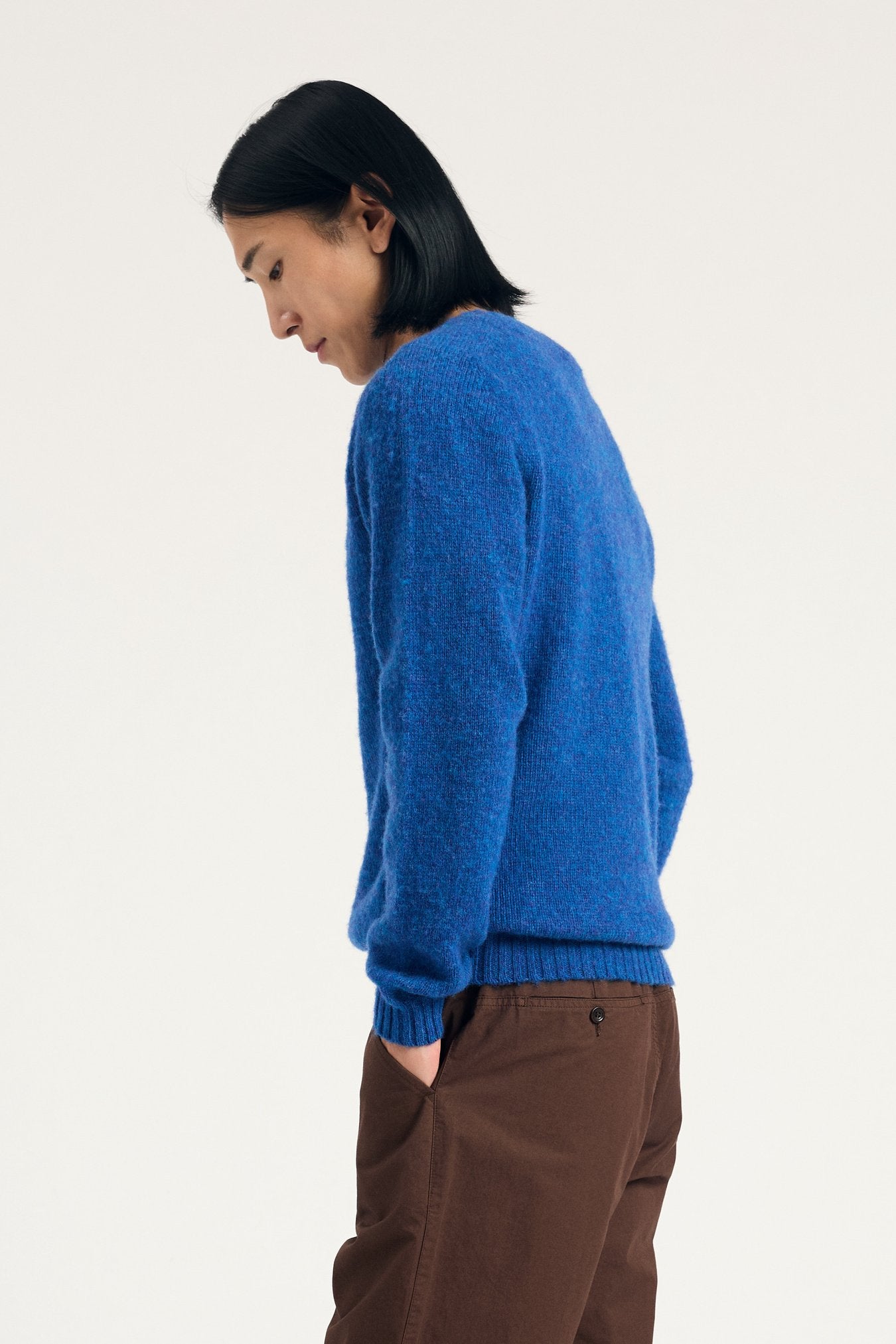 A regular fitting sweater made from Scottish lambswool. It is constructed in Scotland using a seamless tubular knitting technique, which creates a more comfortable garment and improved range of motion.