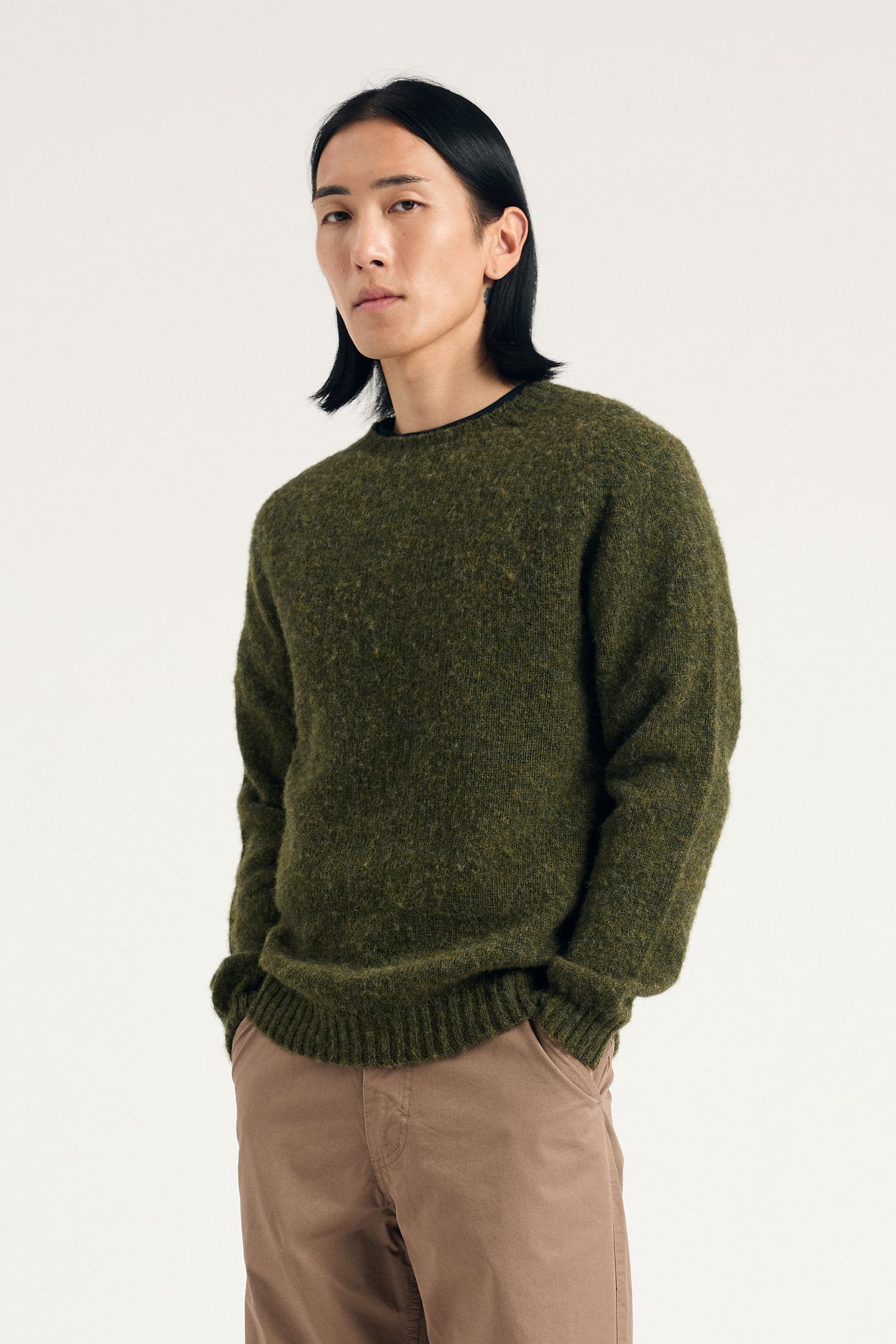 A regular fitting sweater made from Scottish lambswool. It is constructed in Scotland using a seamless tubular knitting technique, which creates a more comfortable garment and improved range of motion.
