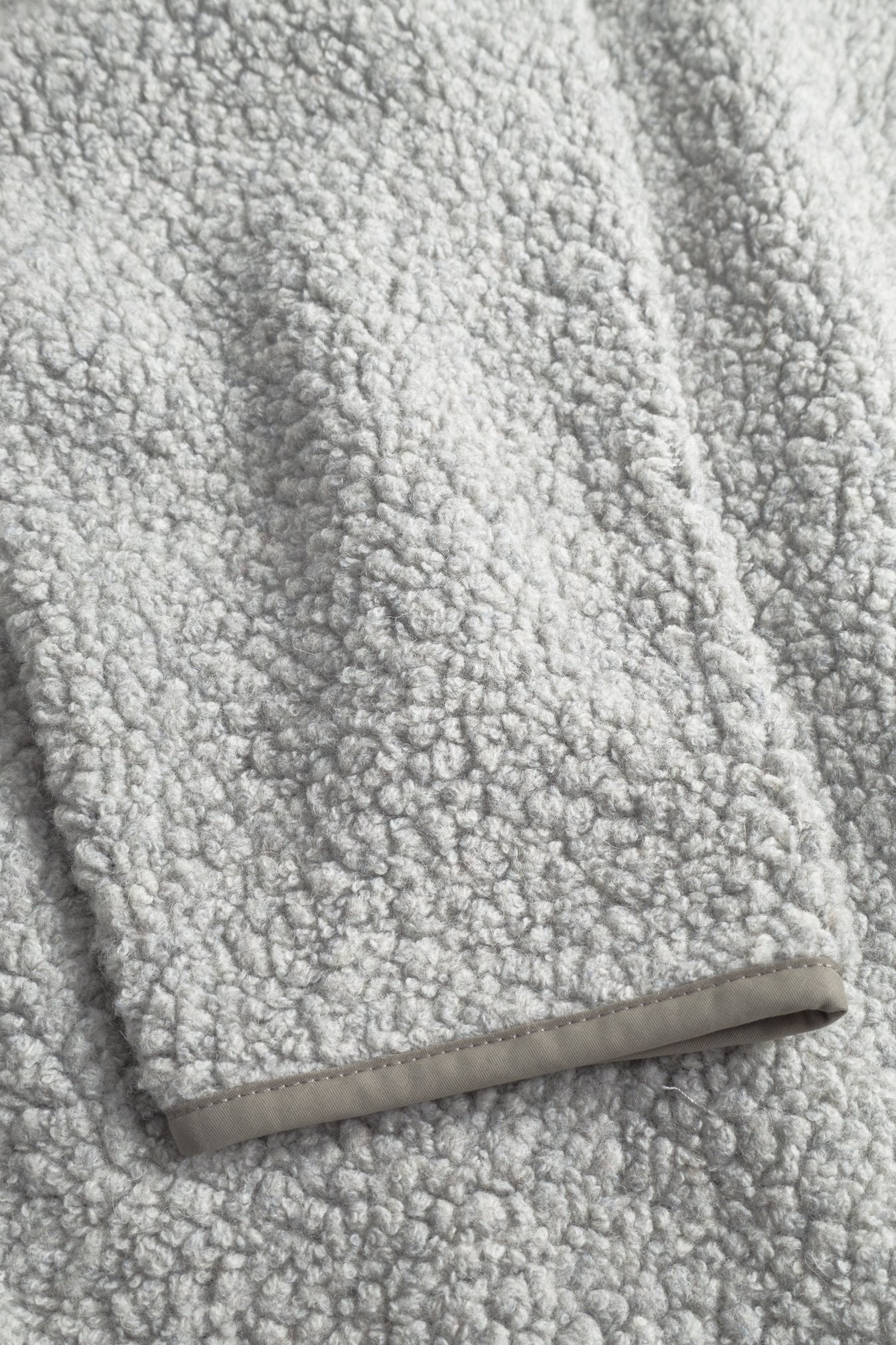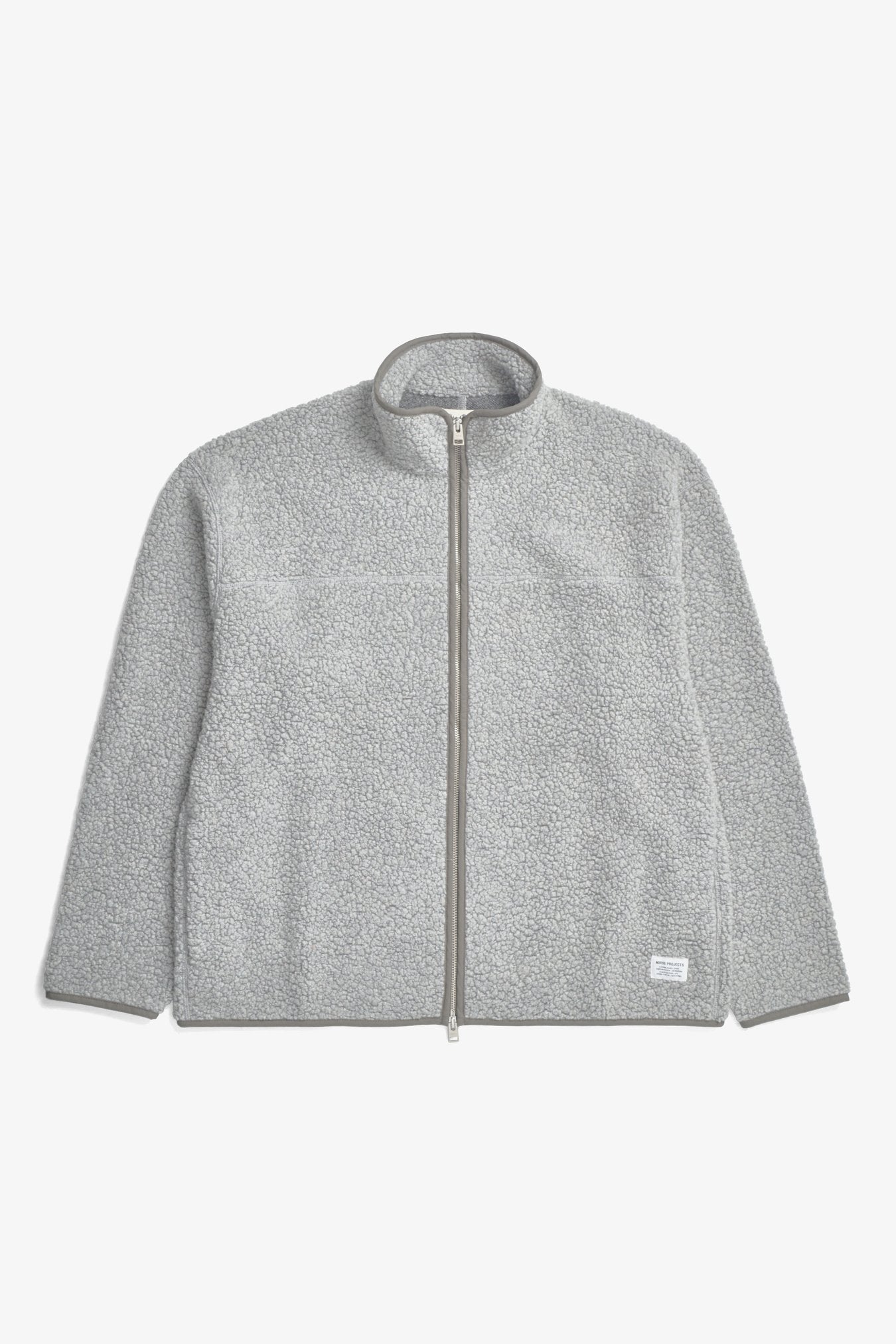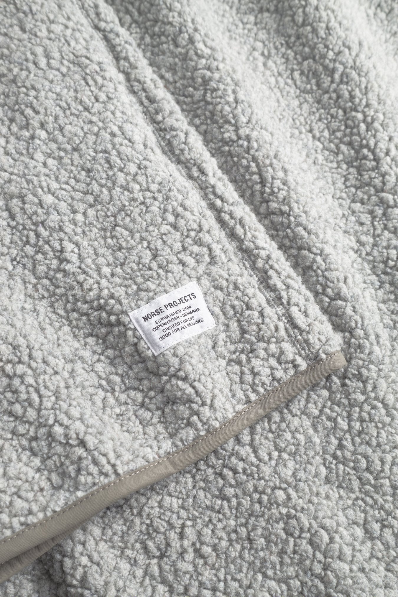 A relaxed fitting stand collar jacket with set-in sleeves cut in an Italian wool blend sherpa fleece. Features a stand collar, hand pockets with hidden snaps, contrast binding details, a branded two-way metal zipper at center front, and finished with flatlock stitching and a branded tab at the front.