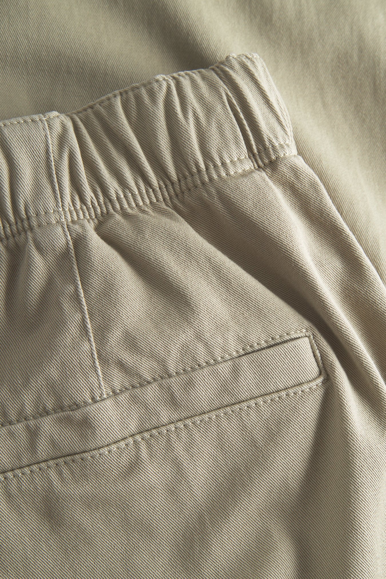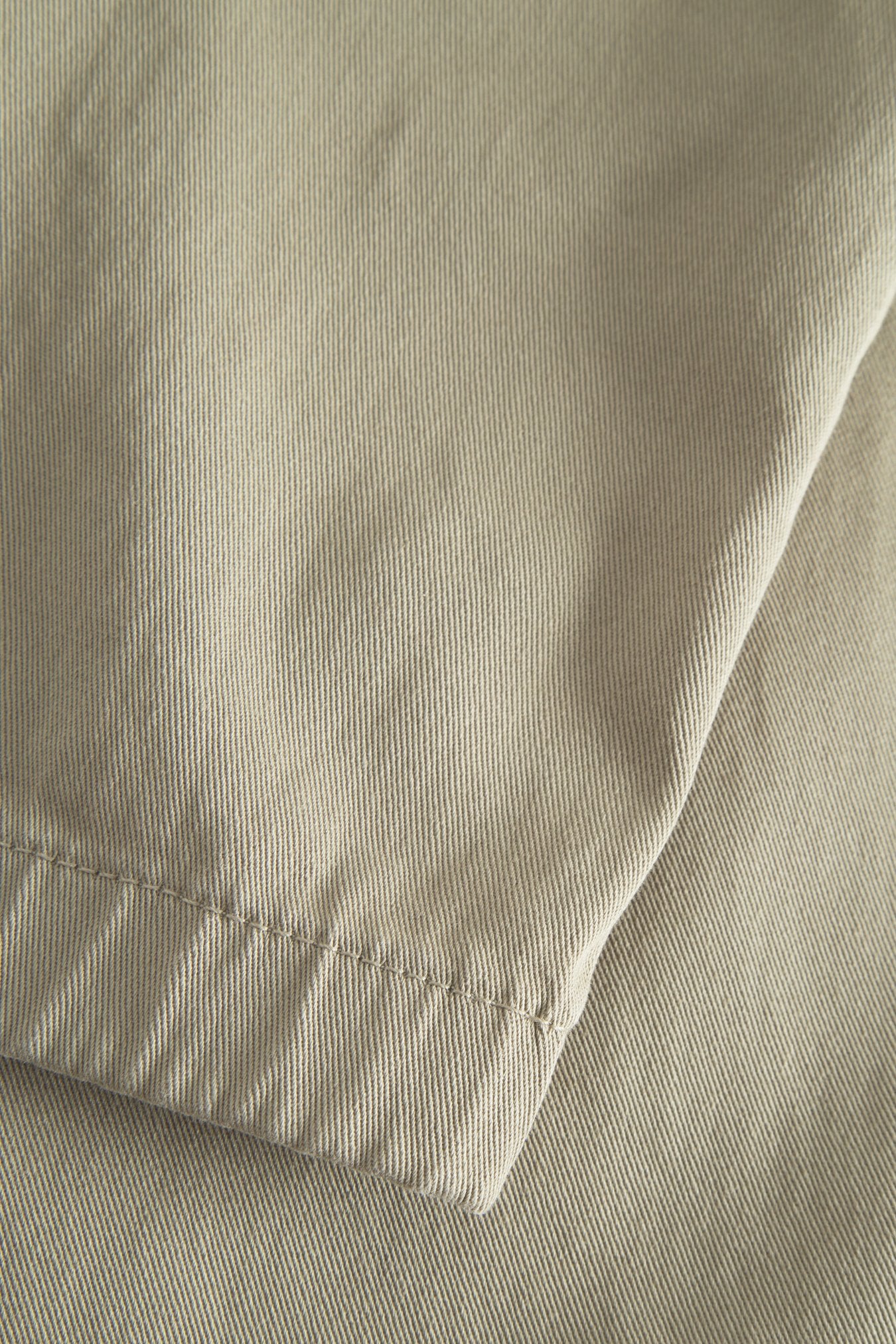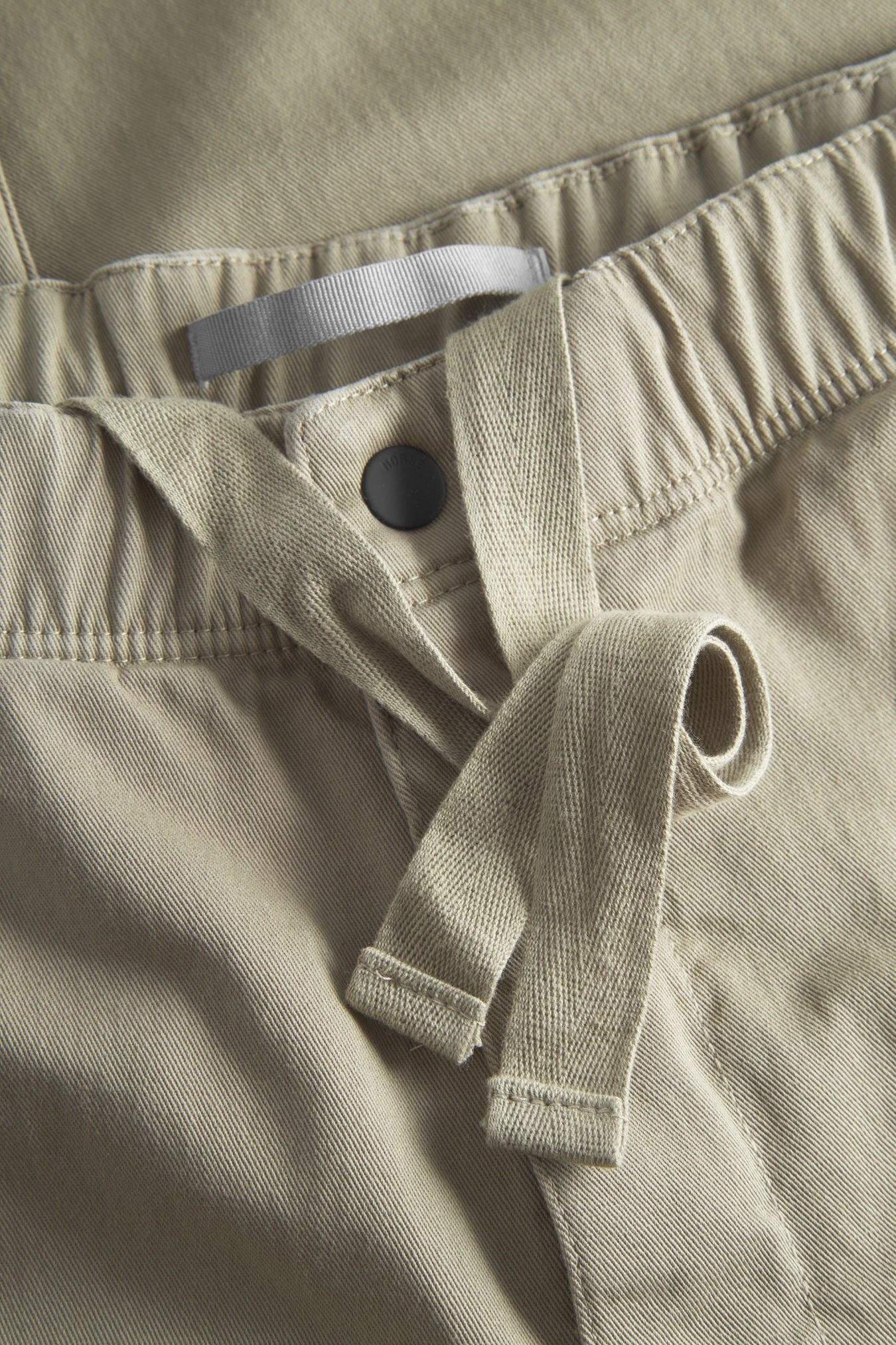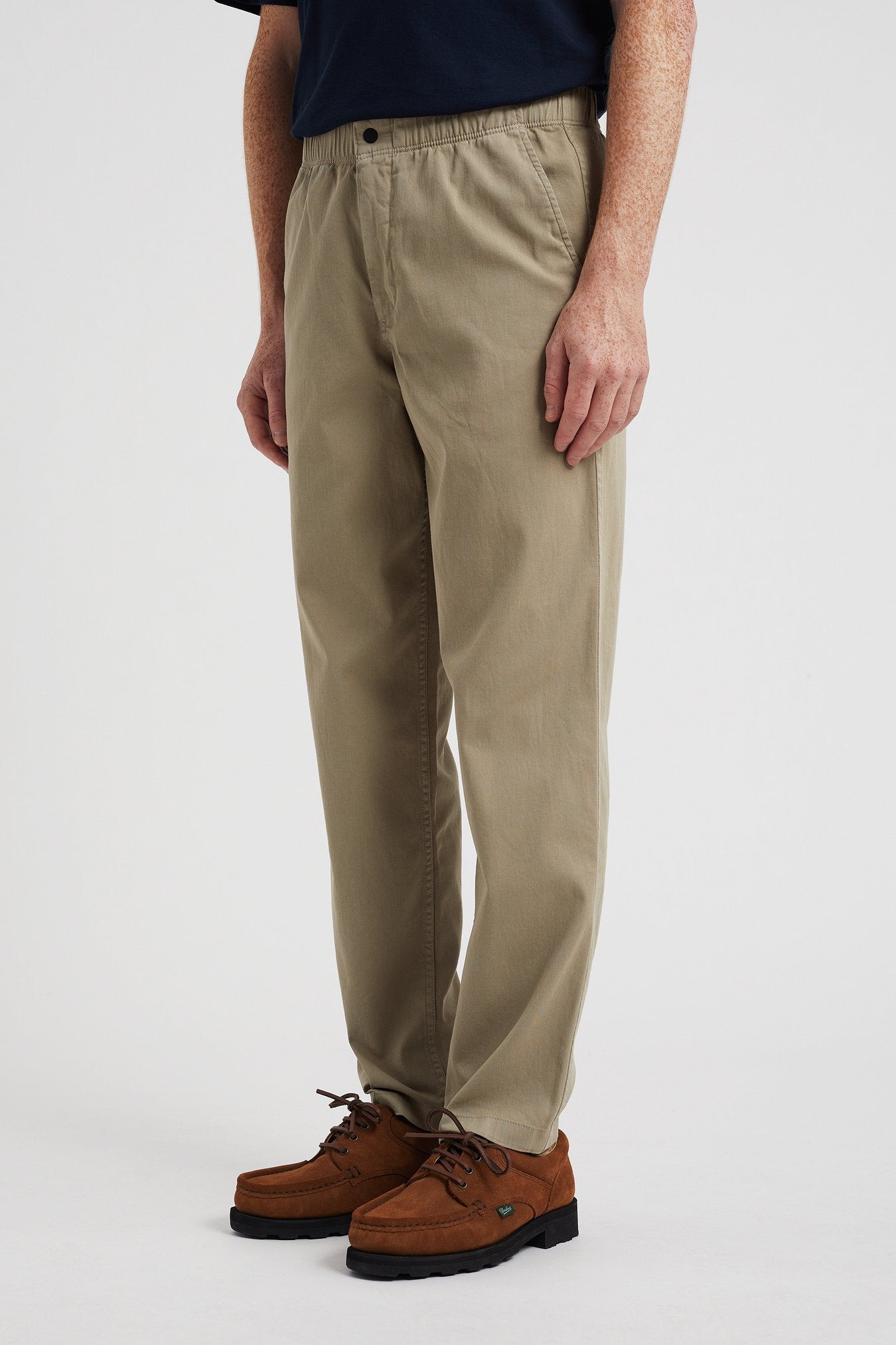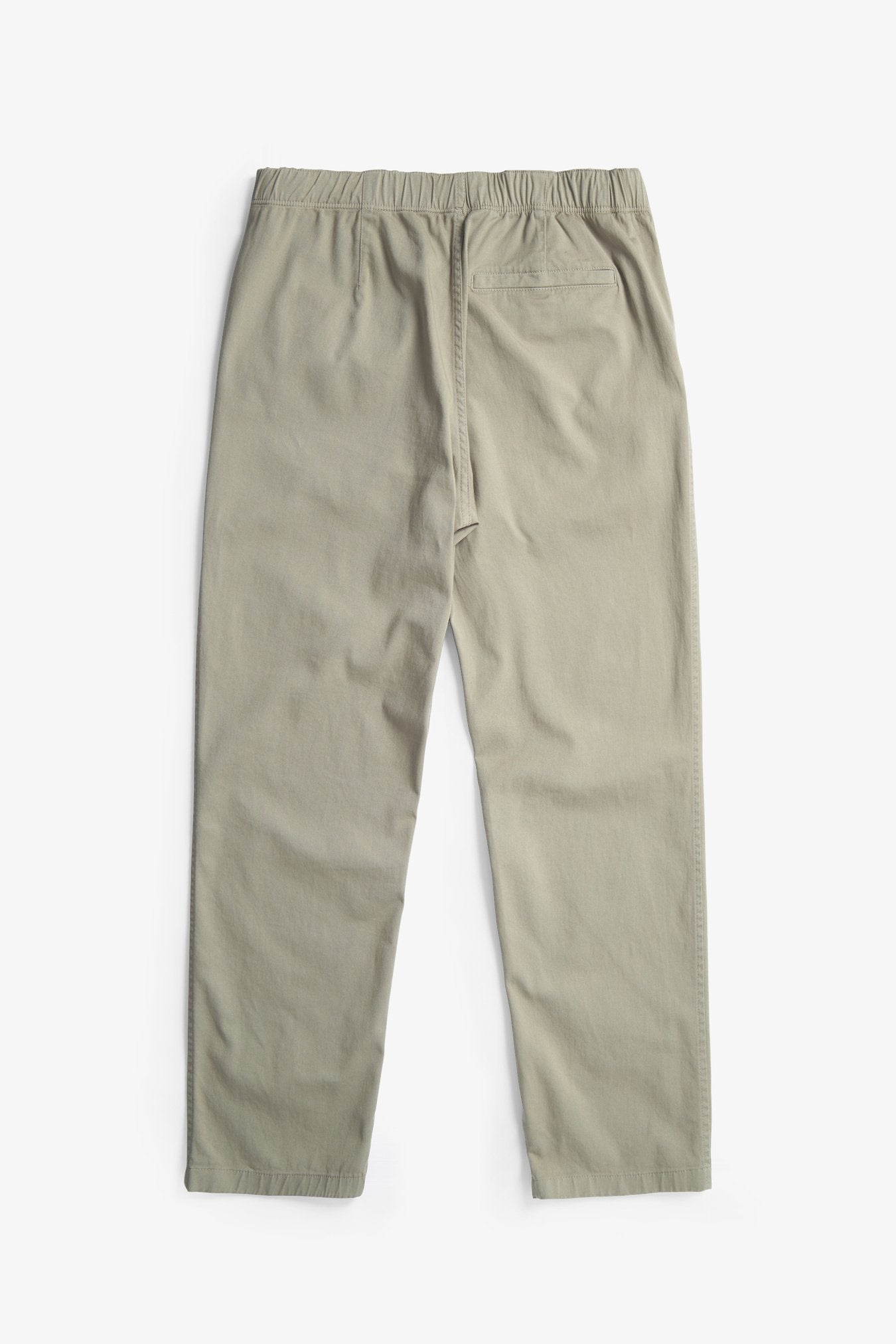 A relaxed fitting pant with a loose leg and elasticated waist constructed from a stretch organic cotton twill. The pants are garment-dyed for a rich colour. Finished with a zip fly, snap closure, drawstring waist and a branded tab at the back.