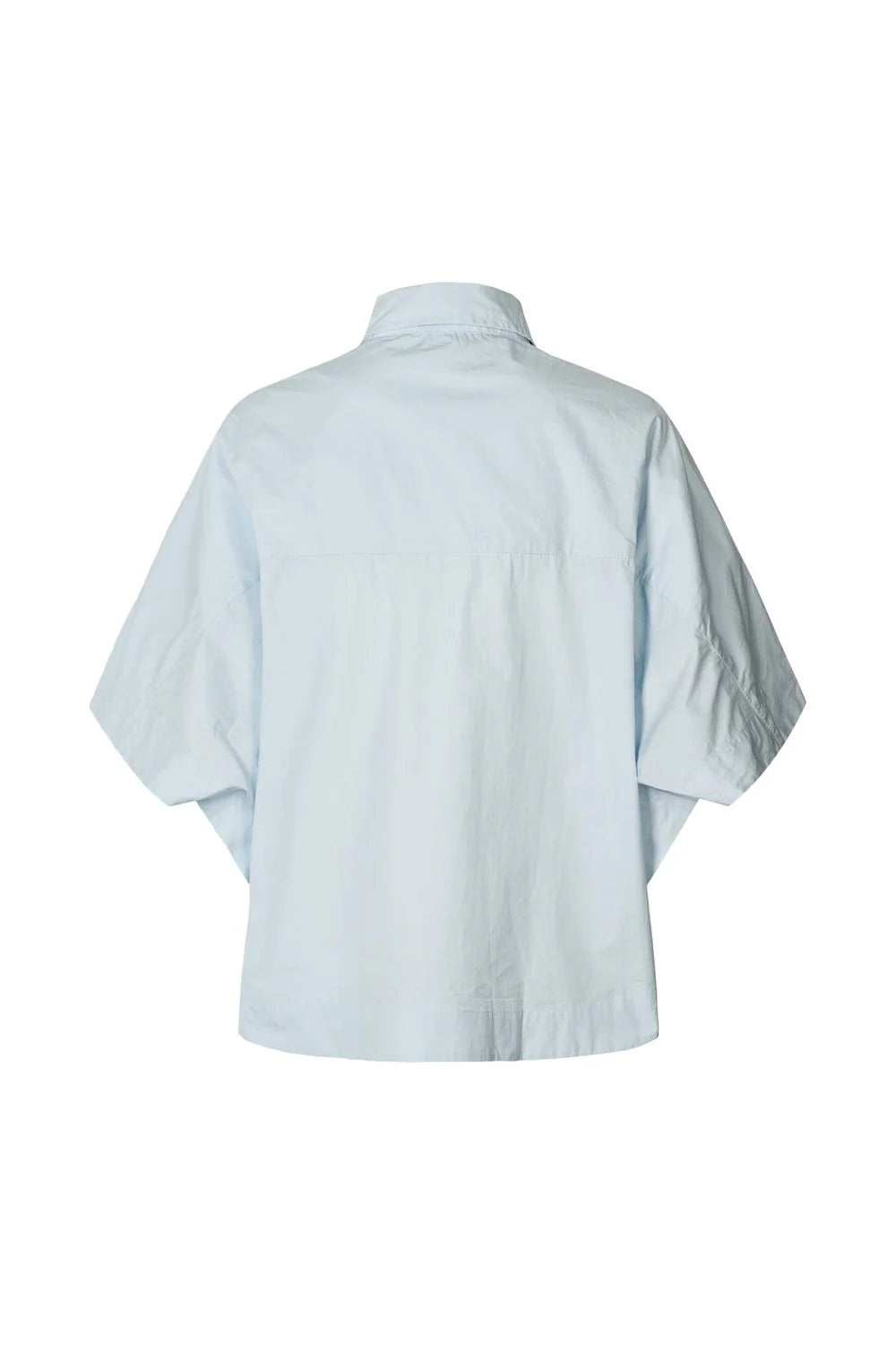 The shirt features a boxy, short fit with mid-length, oversized sleeves, a full button-down front, a chest pocket, and a rounded hem.