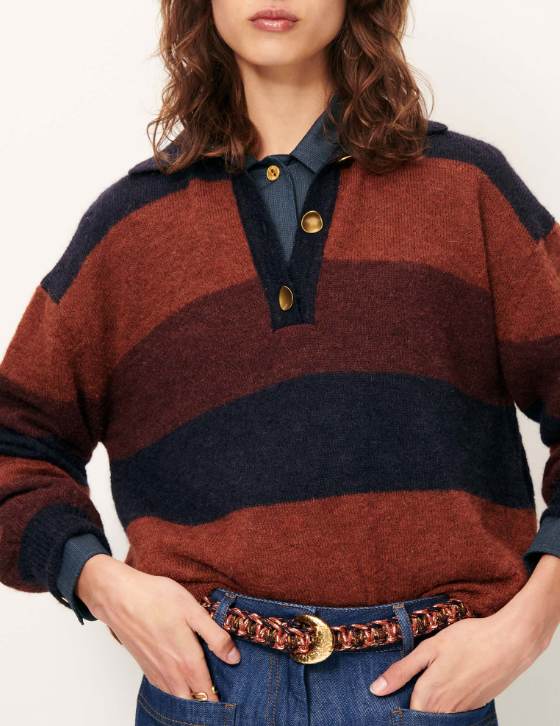 Striped long-sleeved polo-style cropped sweater in a fluffy jersey stitch knit, knitted in Italy.