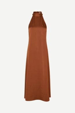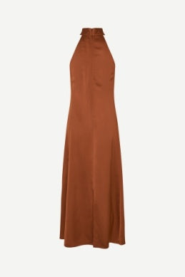 Satin midi dress with a regular fit and A-line skirt. Invisible zipper closure on the back. Halterneck strap. Main material made from 100% recycled viscose.