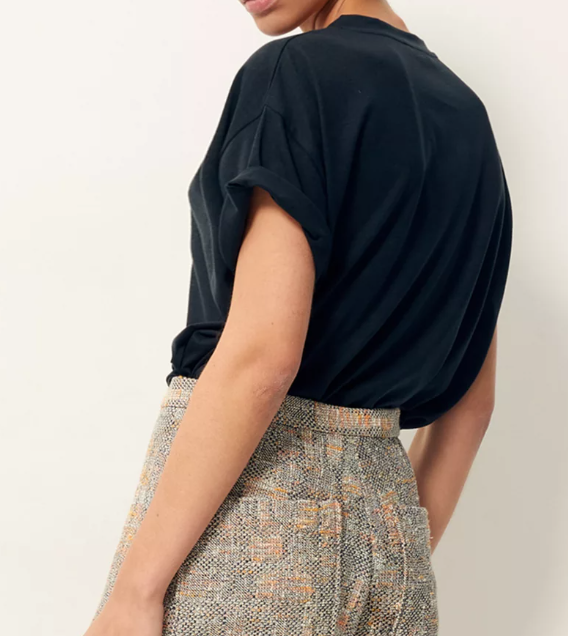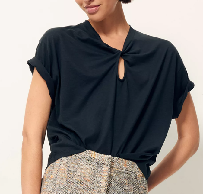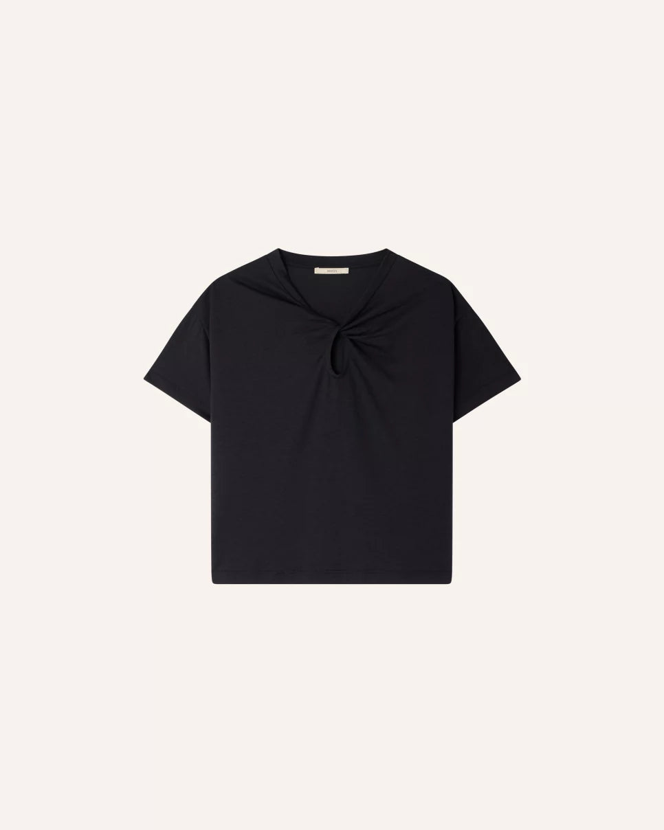 Loose-fitting short-sleeve T-shirt in fluid jersey fabric with a teardrop cutout twist at the front neckline, made in Portugal.