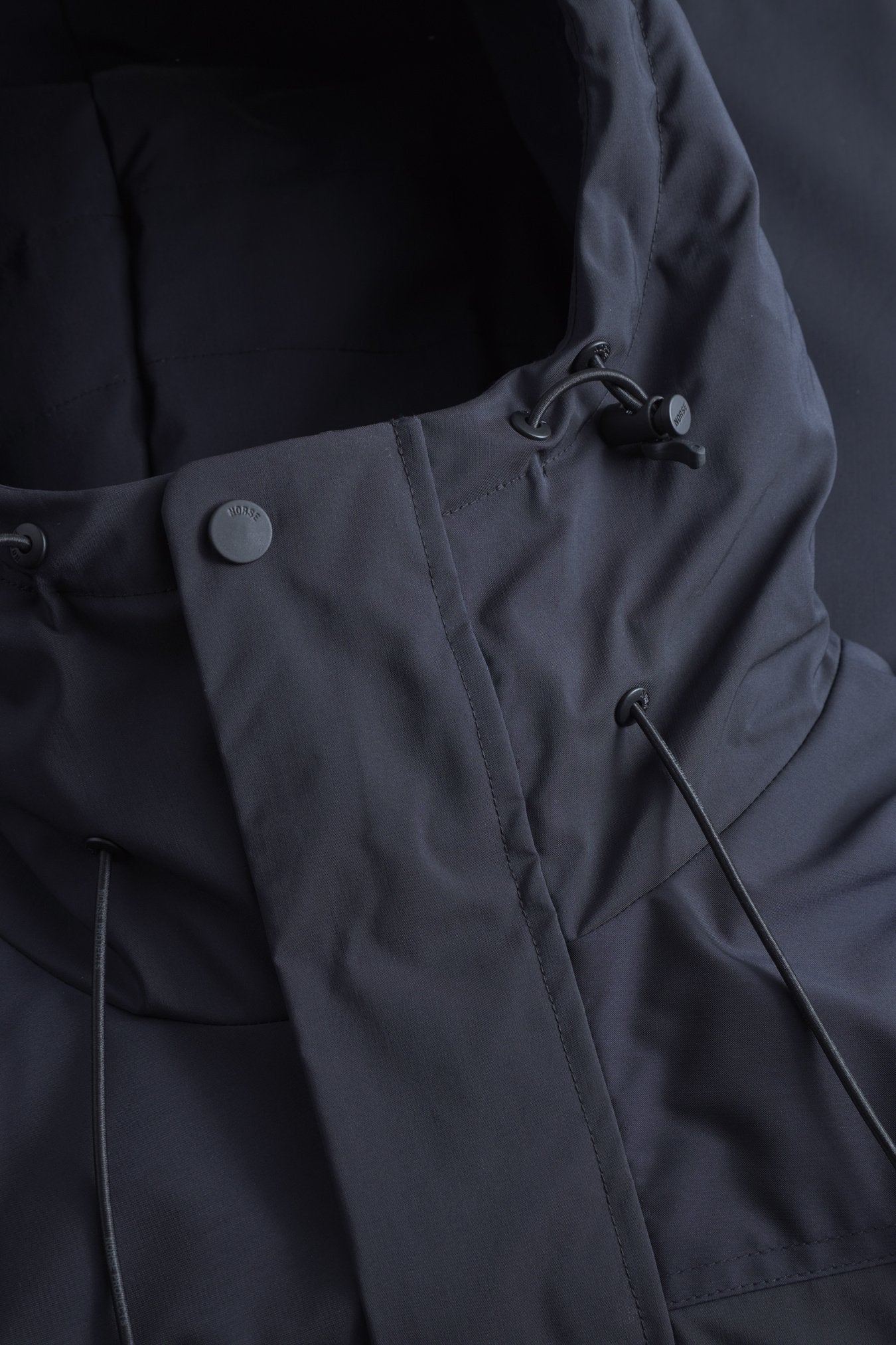 A relaxed fitting short insulated parka in Alpinix™ easy-care Smart Merino wool. Features a two-way zip front opening with snap storm guard, flap pockets, side entry pockets, internal pocket, wool lined body, adjustable hood and hem and synthetic fiber insulation.
