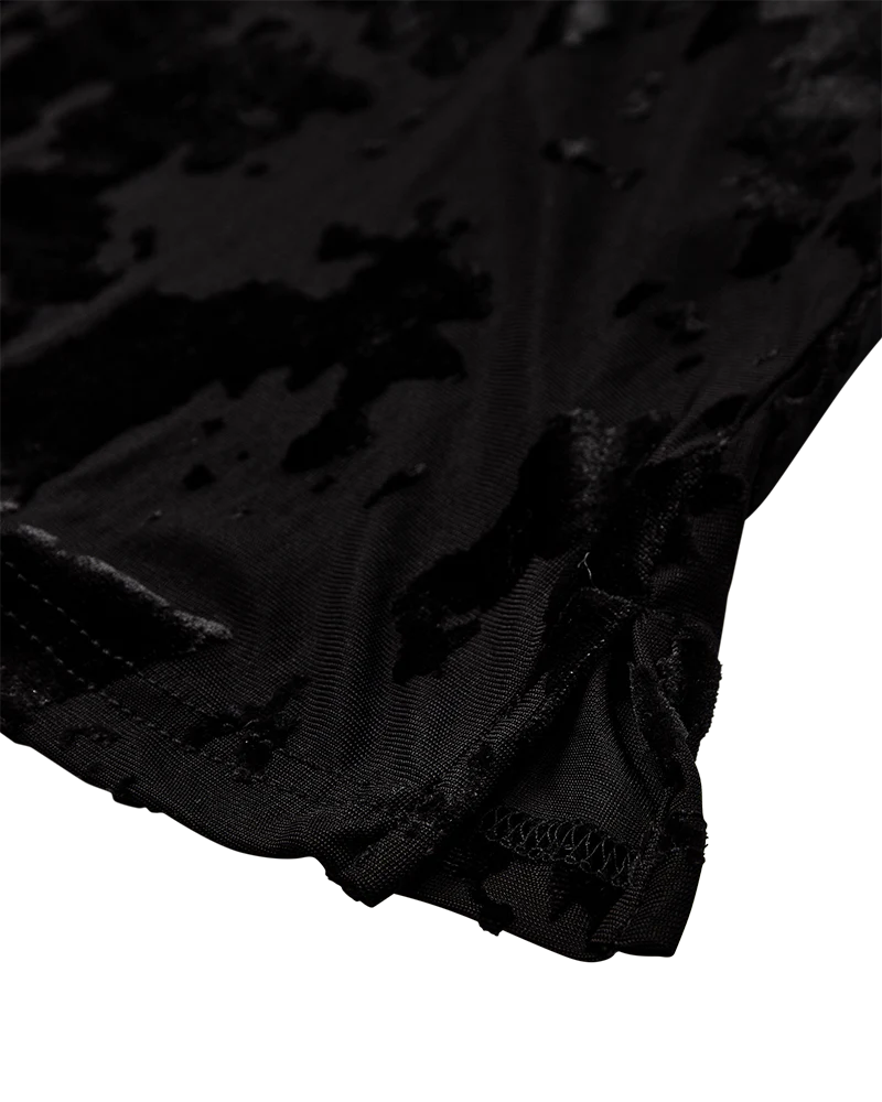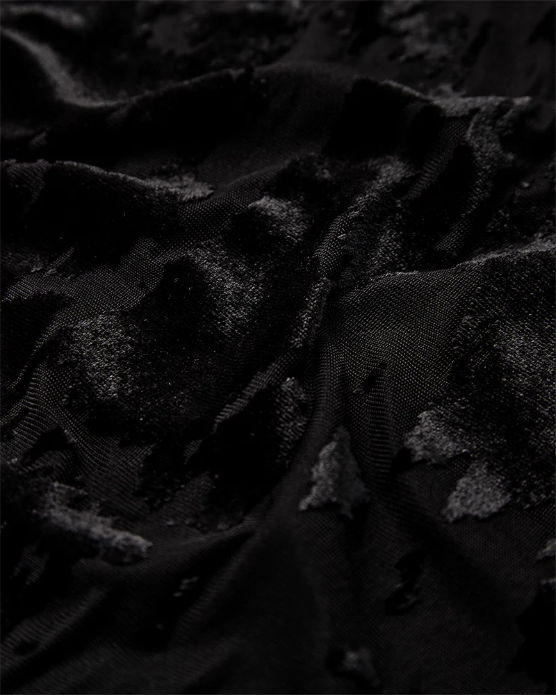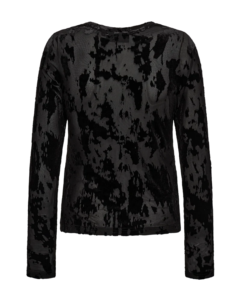 LAME-BLOUSE is a blouse in an elegant mesh material with an all-over flock effect, a tight fit, long sleeves, side slits and a high, rounded neckline.