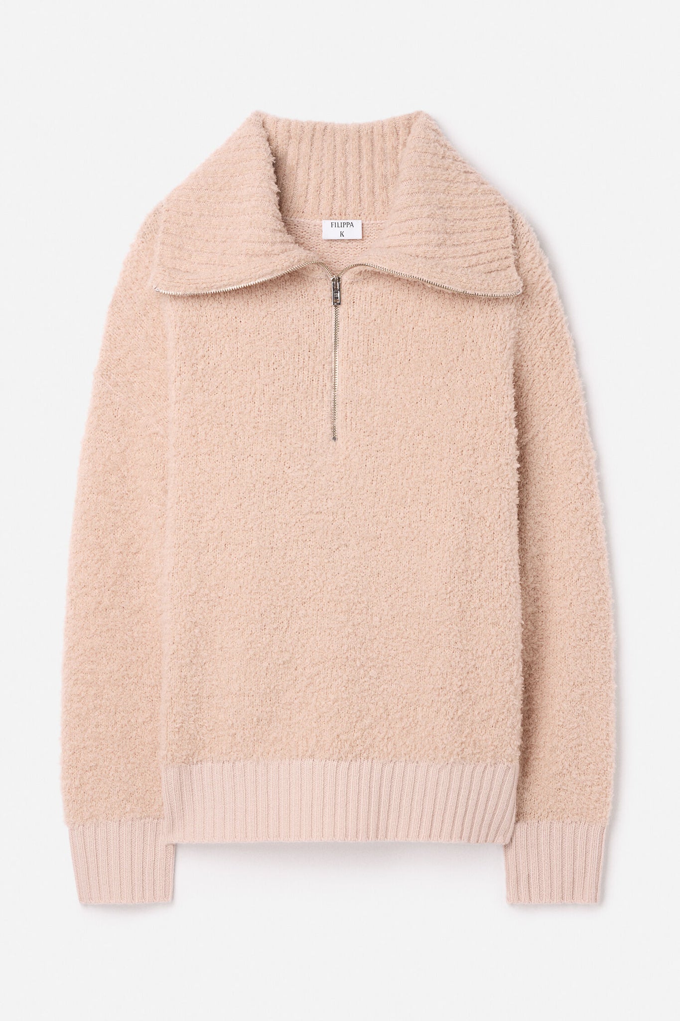 A relaxed fit half zip sweater with contrast yarn detailing. Knit from a chunky, heavyweight certified wool blend with a fluffy ribbed texture. Reach for it on colder days for a cosy touch.