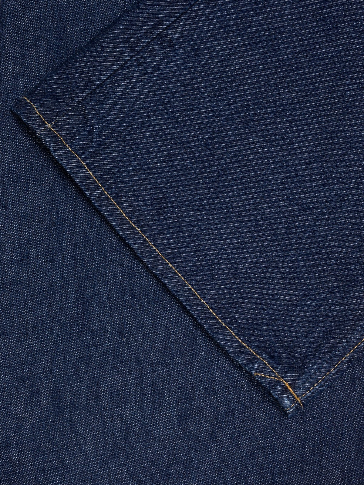 A loose, low-waist fit with a wide leg in a classic blue wash. This wash may not be a full wash, its more of a rinse, but it's just enough to give these jeans an amazingly brilliant blue-blue indigo hue and an astonishing texture. Paired with ochre thread and vintage-inspired metal trims, these jeans are a delightful splash of indigo joy.