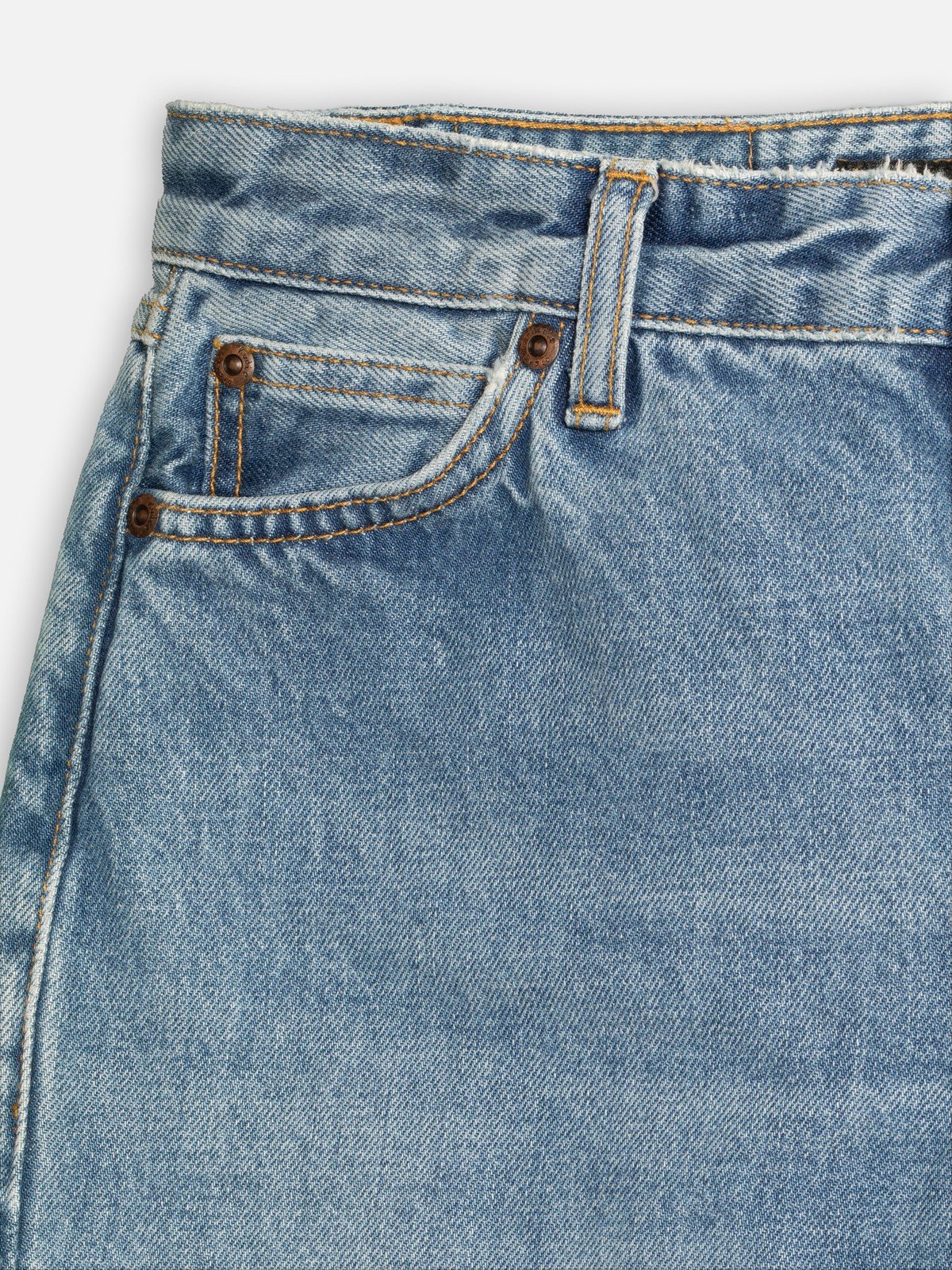A loose, low-waist fit with a wide leg in a light blue wash with an authentic worn and washed appearance. Crafted from a newfound favorite denim of ours, these jeans showcase a perfect balance of ringspun character. Short and defined slubs create subtle streakiness, while a slight crosshatch and a muted marble textures add depth. The dense weave construction lends them a robust hand and a true vintage denim feel. These jeans are truly a work of art, balancing wash and denim craftsmanship for a characterful visual impression and a complex tactile experience.